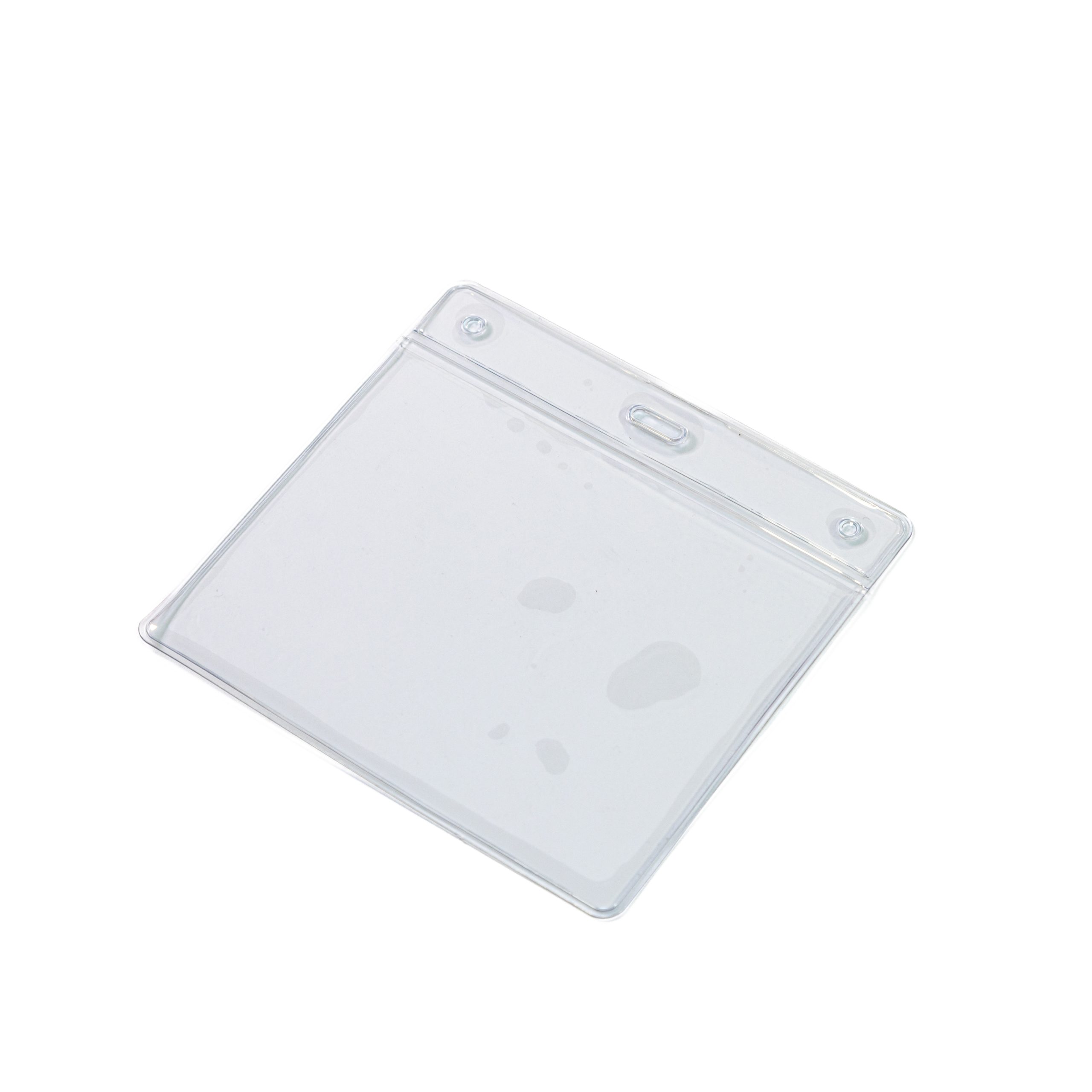 Clear landscape flexible ID card holder with a slot in the centre and a hole in both corners at the top of the holder.