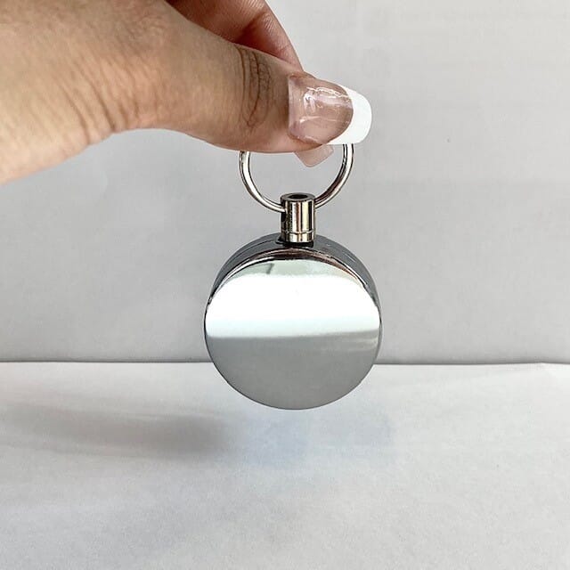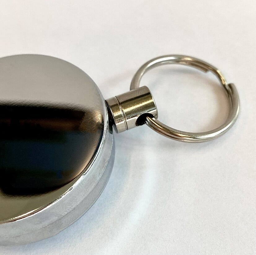 Chrome Heavy-Duty Retractable Reel with Belt Clip, 24mm Key Ring Attachment and a 60cm long Nylon Cord.